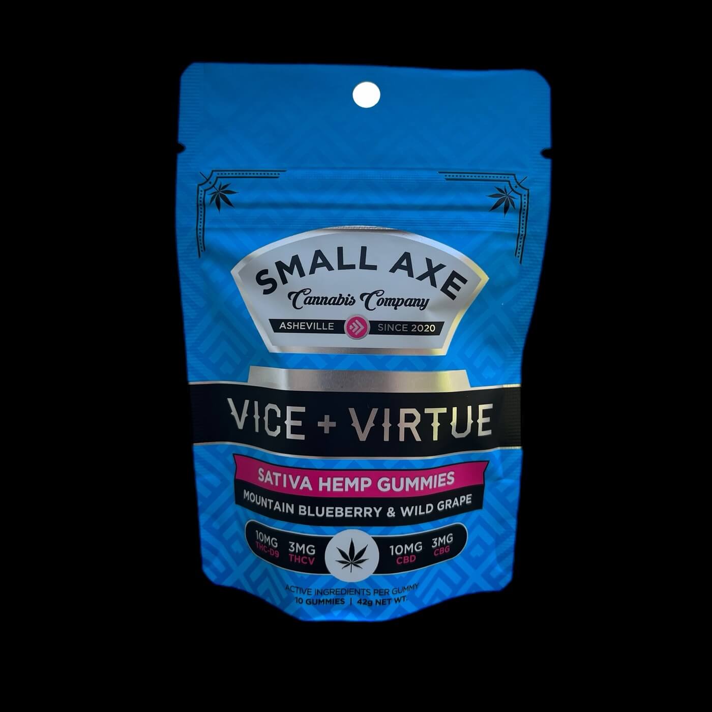 Small Axe’s Vice + Virtue Sativa Gummies  are an all-natural Full Spectrum, Vegan, Delta 9 + Thcv gummy formualted for those wanting a more uplifting psychoactive effect 🌞  Two delicious all-natural flavors Mountain Blueberry & Wild Grape.  The formulation takes the amounts of Delta 9 to the legal limit and also includes 10mg CBD, 3mg THCV, & 3mg CBG.  THCV is a rare “Varin” cannabinoid found originally in South African equatorial Sativas.  Expect a more delayed but longer lasting onset with a more uplifting, though provoking, creative effect.  We know you are going to love this new addition ❤️